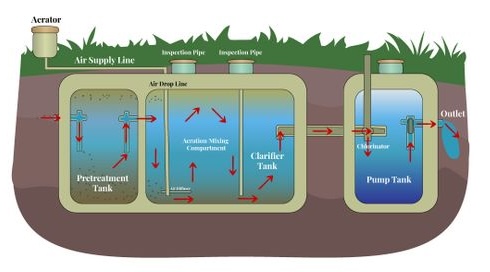 The purpose of an aerobic septic system is to allow a cleaner effluent (“wastewater”) to leave the septic tank. This is accomplished by pumping air into the tank, which encourages “aerobic bacteria” that breathe and work more efficiently, as opposed to anaerobic bacteria in a typical septic tank, which do not require air and are less efficient.