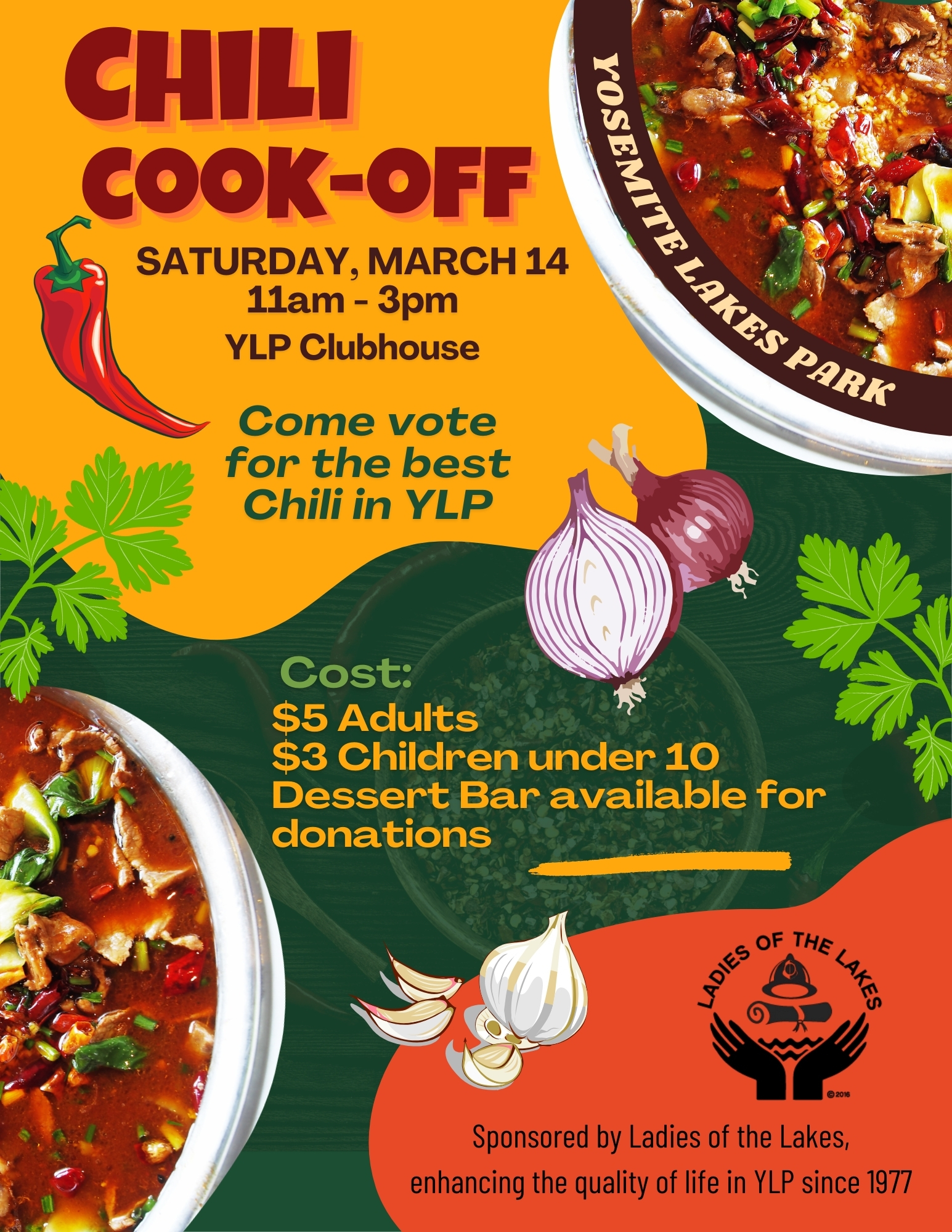 Come vote for the best Chili in YLP! Saturday, March 14 from 11am-3pm in the YLP Clubhouse $5 Adult Admission $3 Children under 10 Dessert Bar available for donations