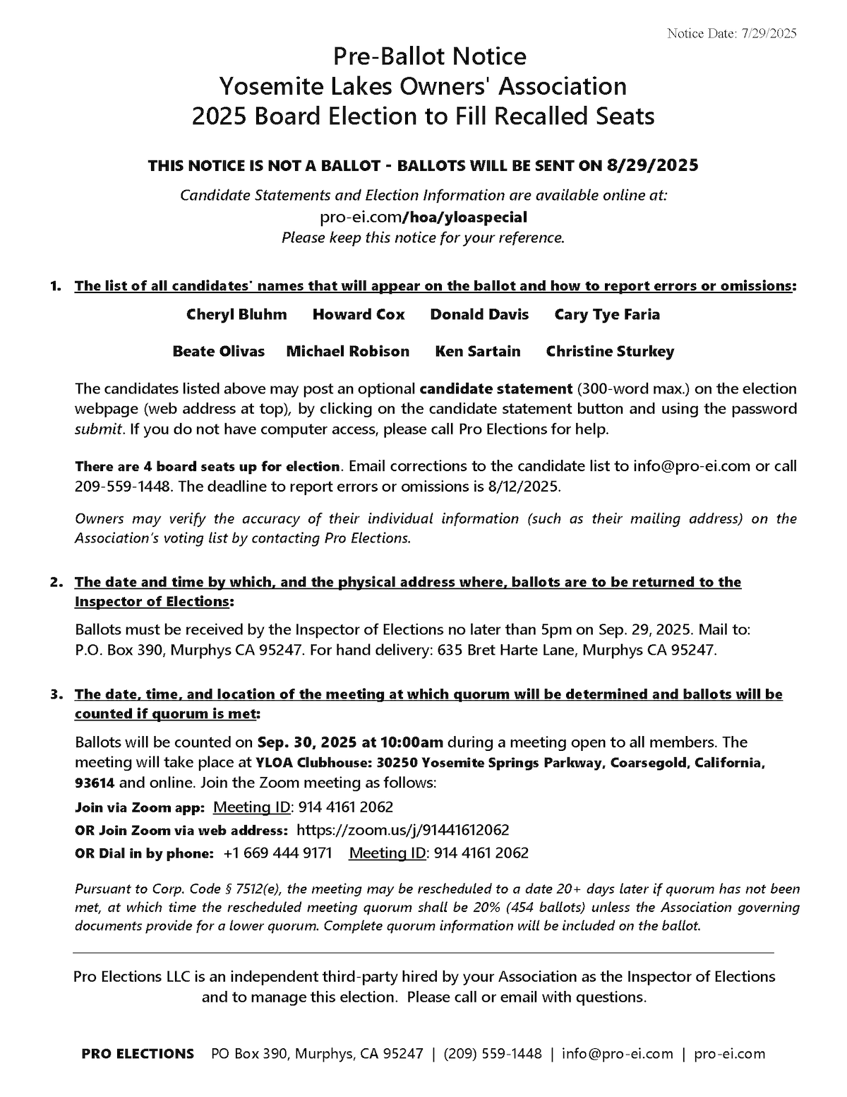 An election is being held to fill four YLOA Board of Director seats vacated by recall earlier this year. At 10 a.m. on Tuesday, Sept. 30, a meeting will be held at which quorum will be determined and ballots will be counted if quorum is met.