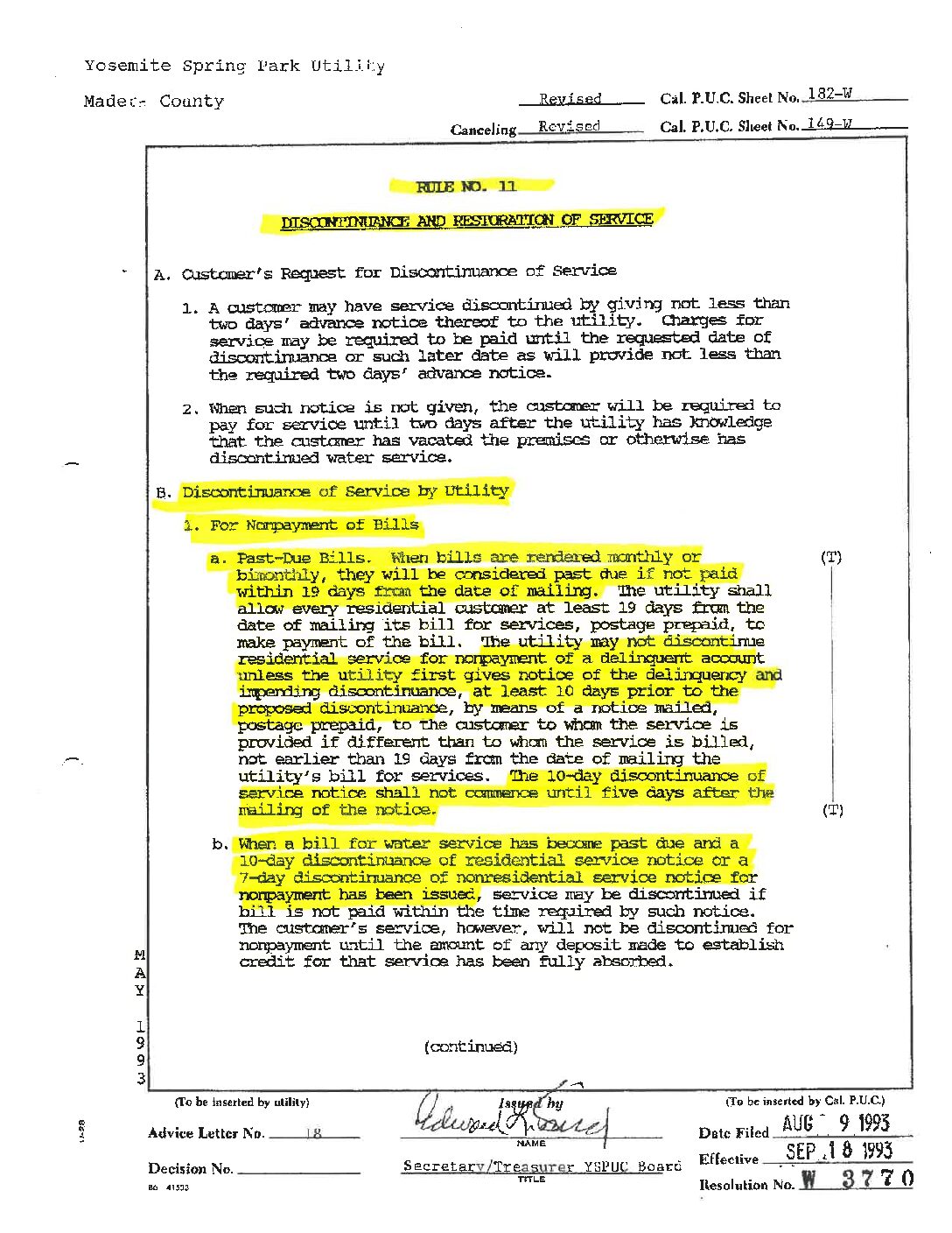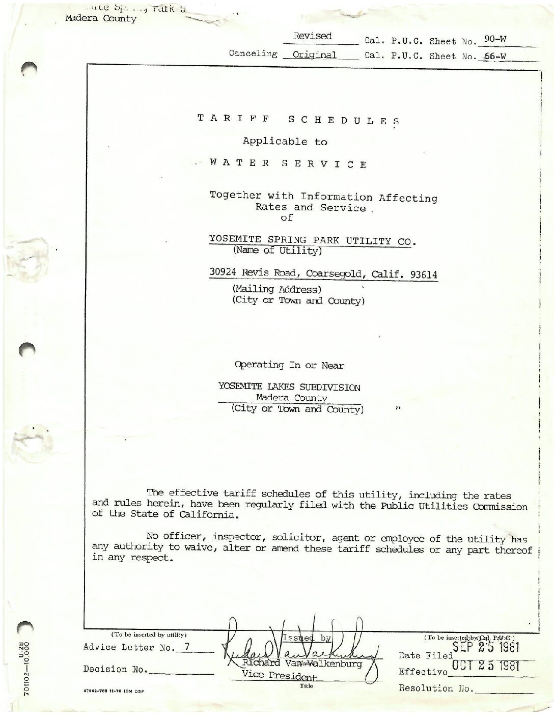 The Tariff Book is YSPUC’s policy document from the California Public Utilities Commission. It is a historical working document.