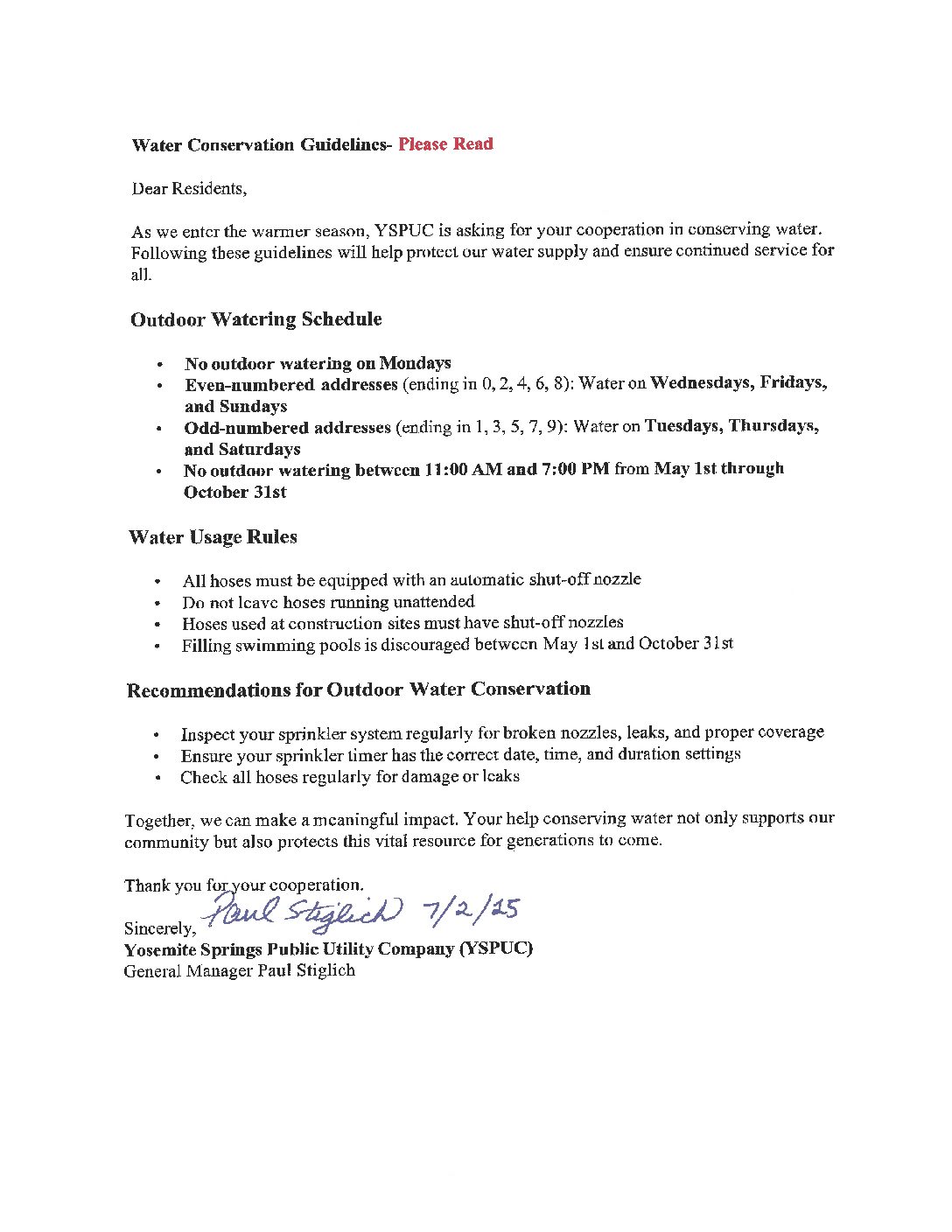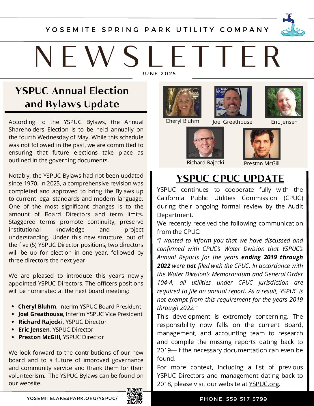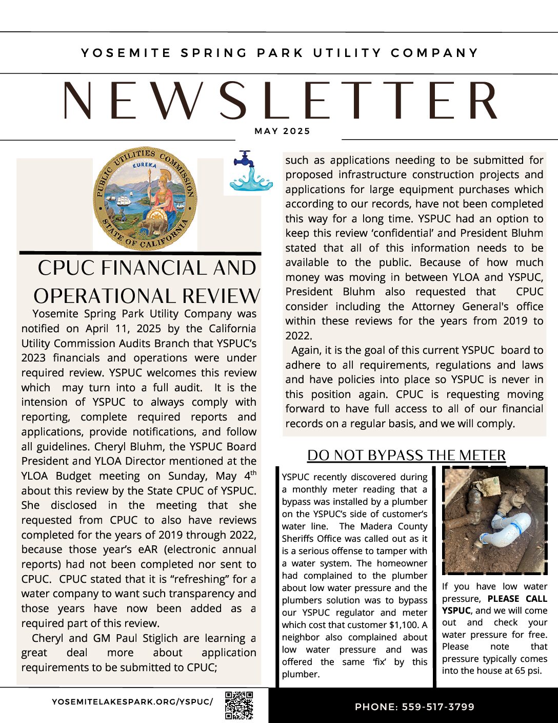 At the May 2025 YSPUC Board of Director’s meeting General Manager Stiglich presented a revised document for approval, “New Construction Application” for a water meter.
