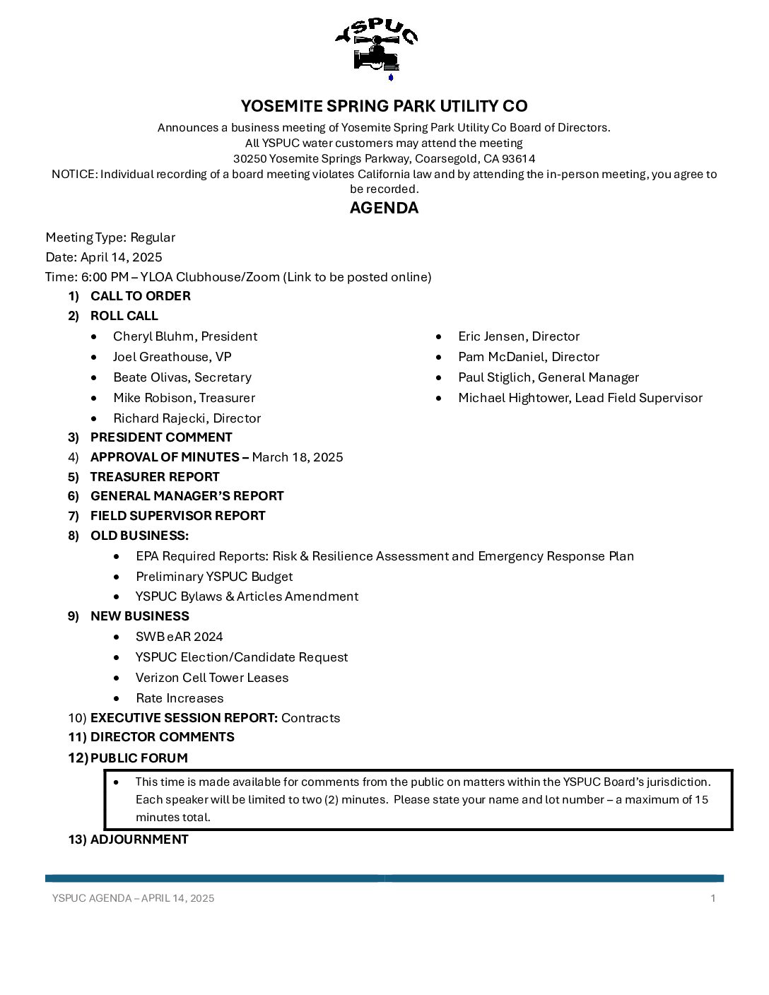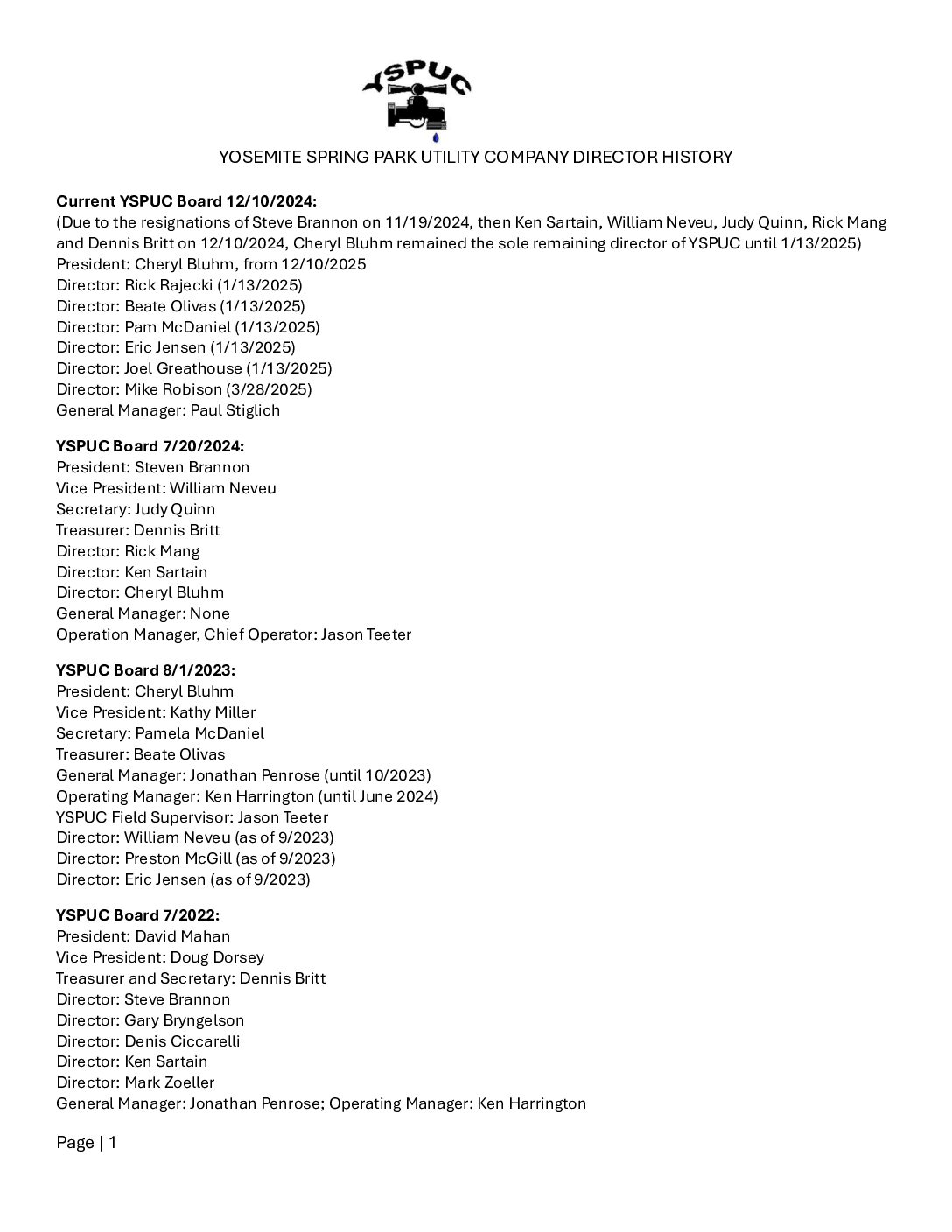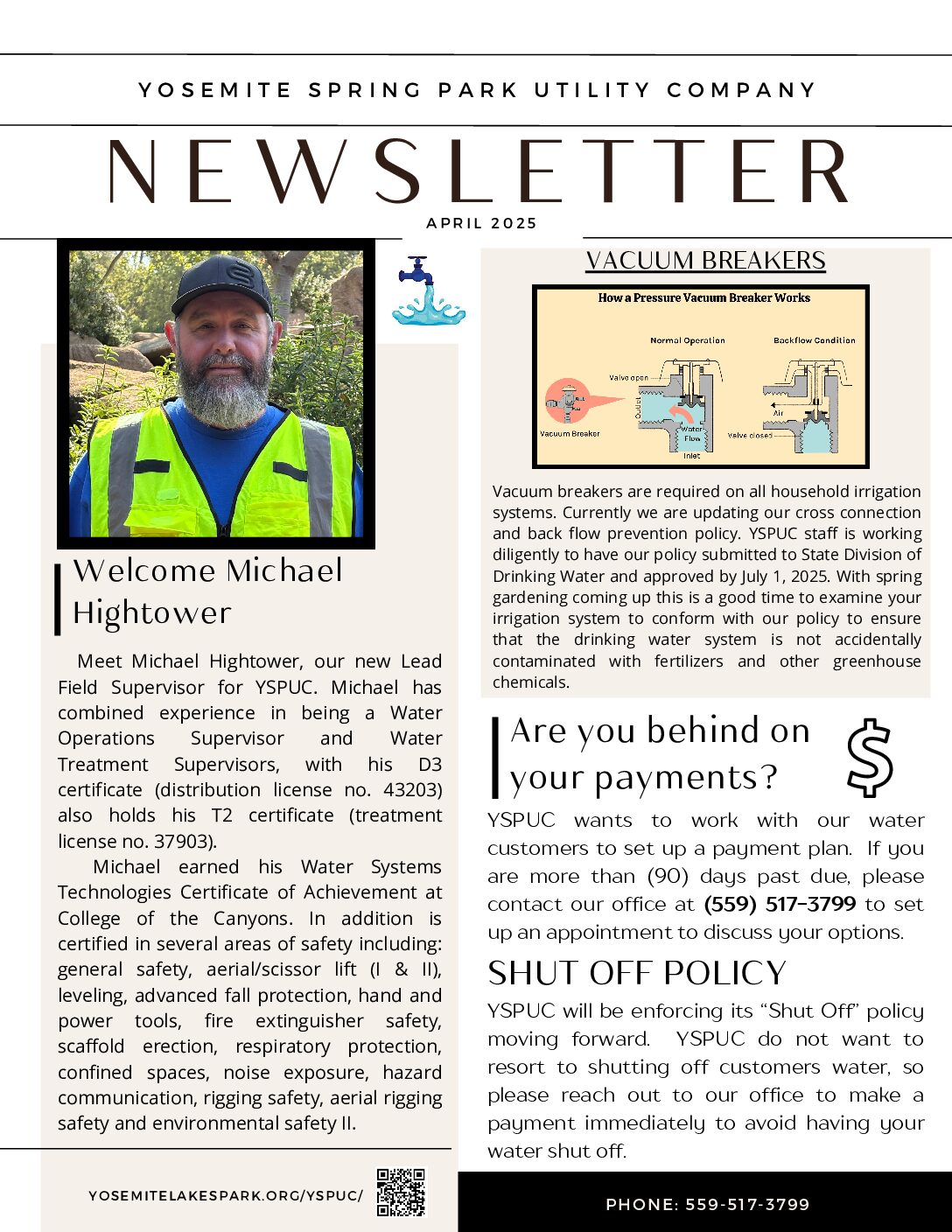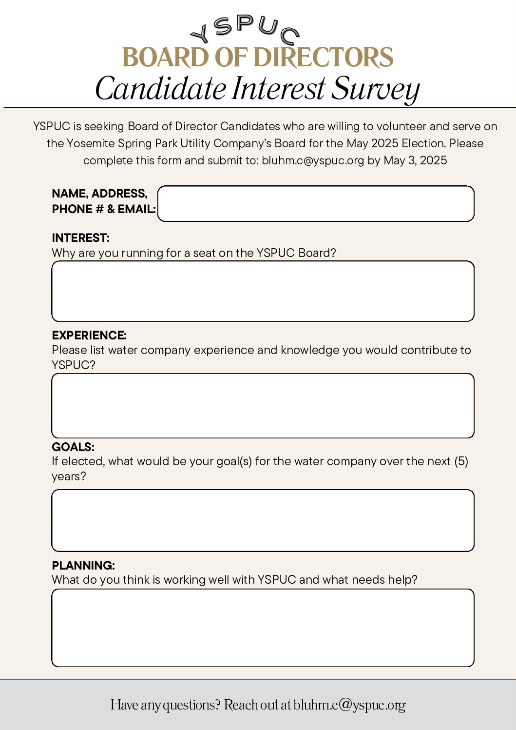 At the May 2025 YSPUC Board of Director’s meeting General Manager Stiglich presented a revised document for approval, “New Construction Application” for a water meter.